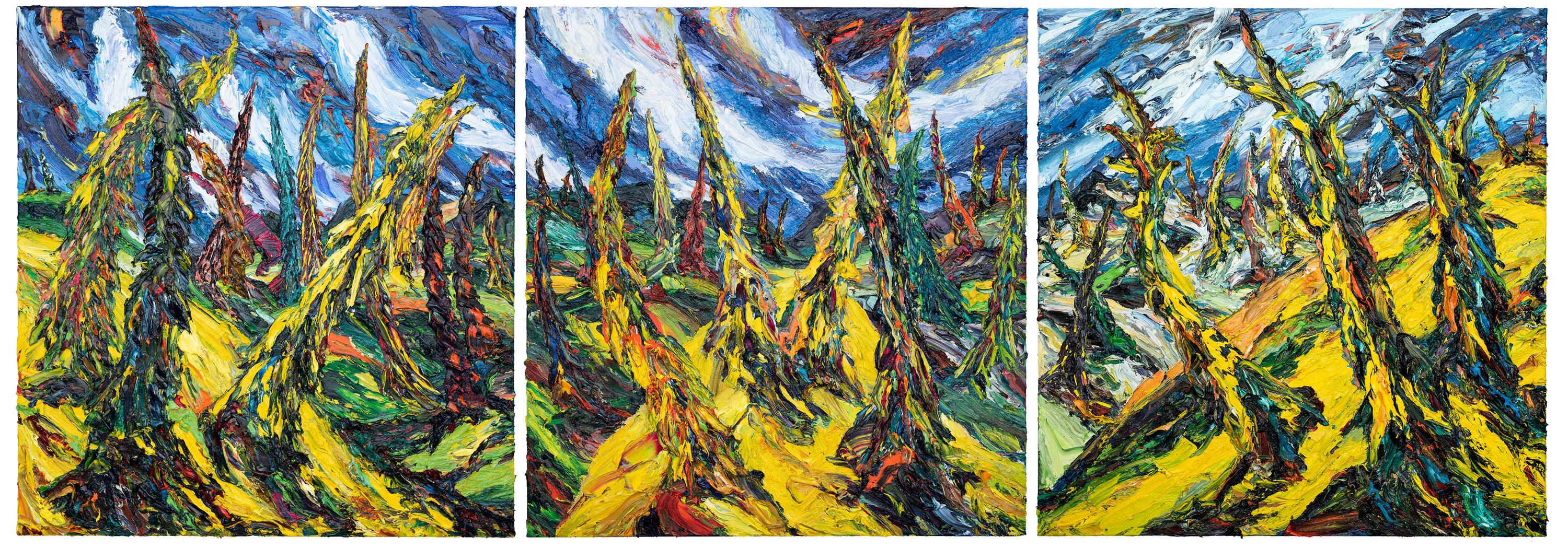 „Tannen“ ist ein Triptychon aus drei gleich großen Leinwänden, das den Wald nicht als geschlossenes Ganzes, sondern als spannungsreiches Nebeneinander zeigt. Die Aufteilung verstärkt Bewegung und Rhythmus, als würde sich das Motiv über mehrere Zustände hinweg entfalten. In einem dynamisch-expressiven Farbspiel aus Gelb, Grün und Rot stehen die Bäume vor einem bewegten, wolkigen Blau. Alles scheint in Unruhe. Die Tannen erscheinen wie Akteure, die sich biegen, winden und behaupten.