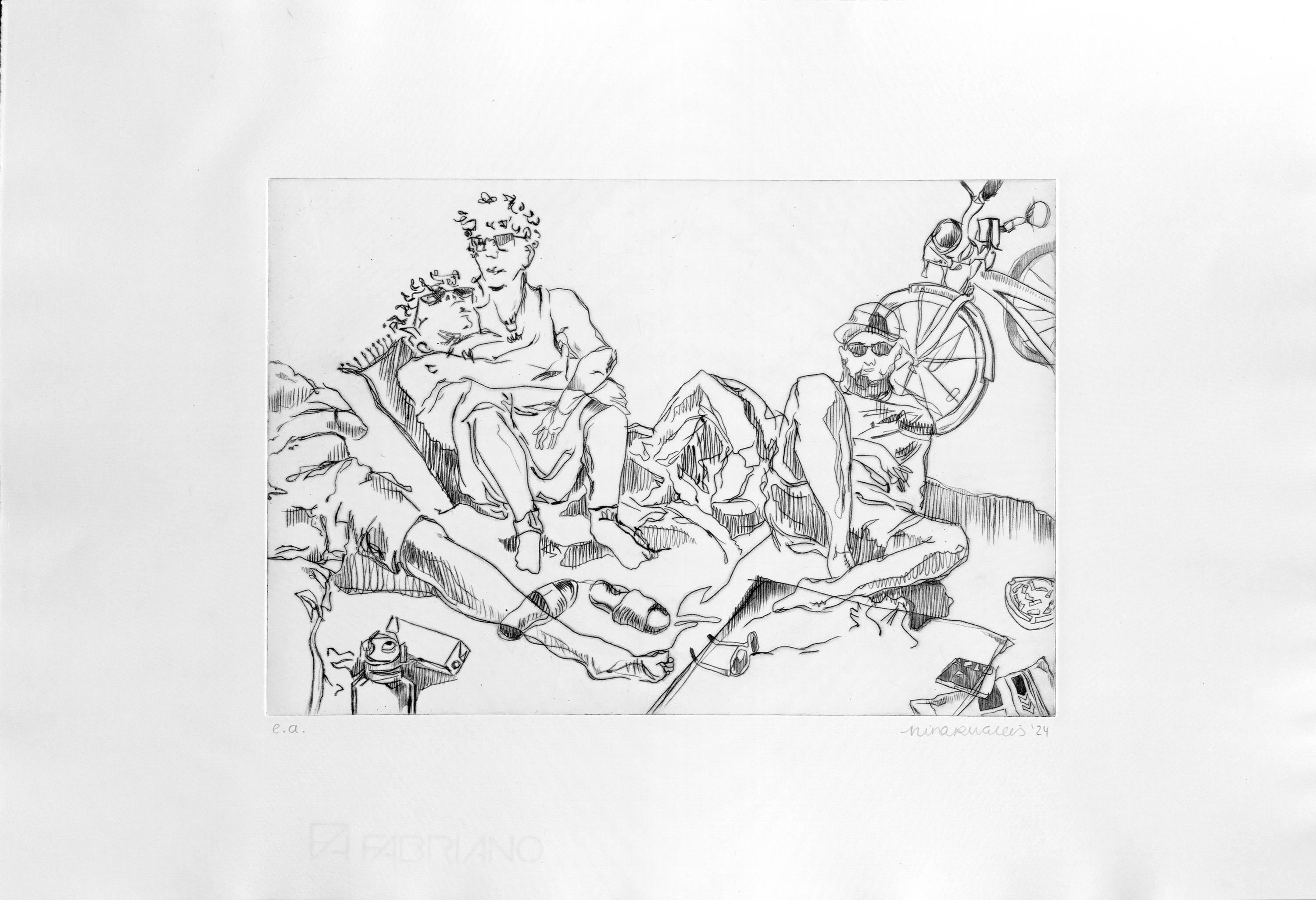 Die Druckgrafiken von Nina Rugullis entstehen aus Skizzen sozialer Situationen. Das Zeichnen dient ihr als Werkzeug, um trotz sozialer Ängste am Geschehen teilzunehmen und gleichzeitig eine schützende Distanz zu wahren. Im langwierigen Druckprozess der Kaltnadelradierung verarbeitet sie das Erlebte künstlerisch weiter.