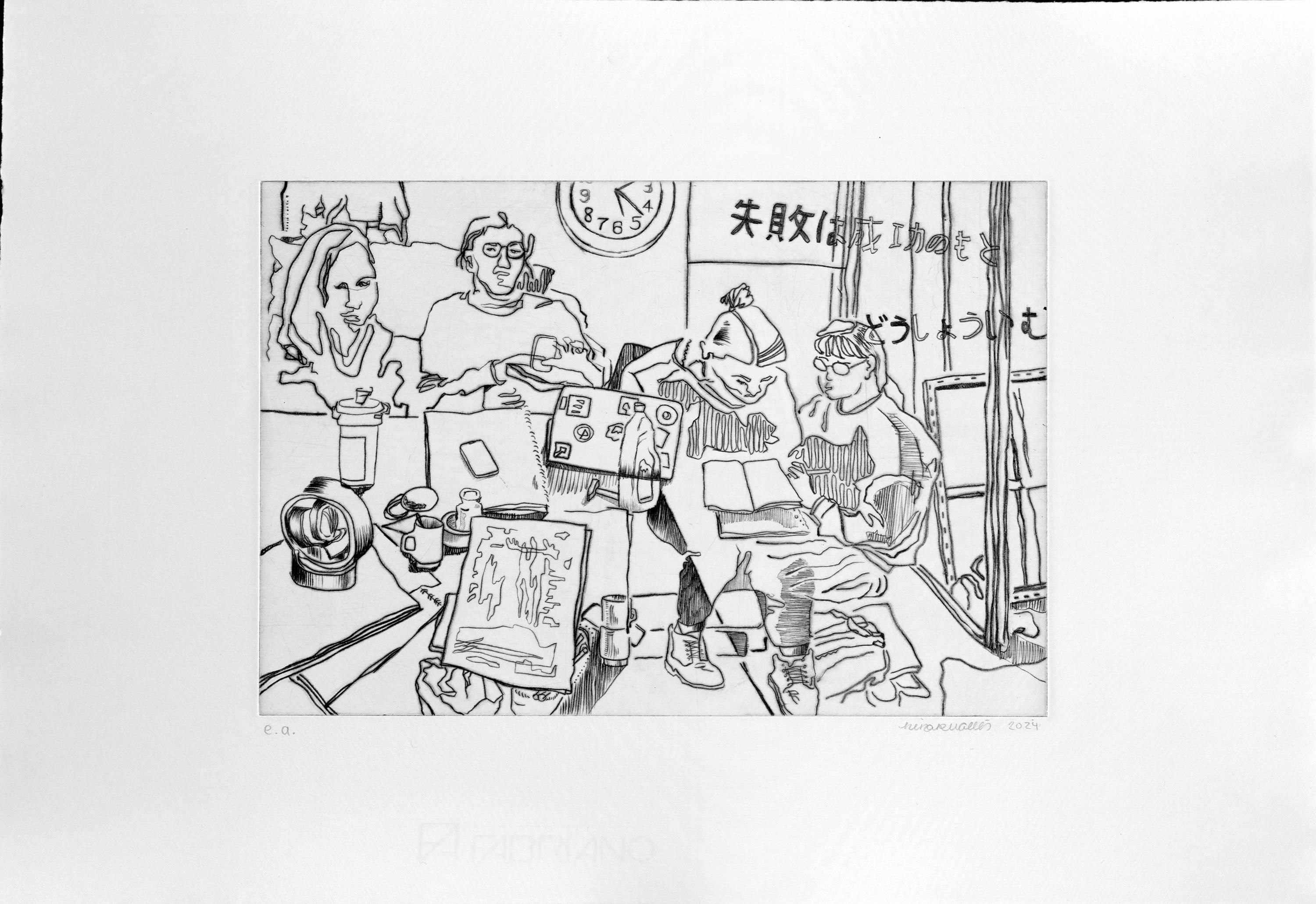 Die Radierung „Sprachkurs“ zeigt Individuen beim gemeinsamen Lernen. Das Werk thematisiert das „Body Doubling“: Die Anwesenheit anderer hilft hier, produktiv zu bleiben und Prokrastination durch soziale Verbindlichkeit zu überwinden. Es verdeutlicht die Verzahnung von Bildung und Sozialem.