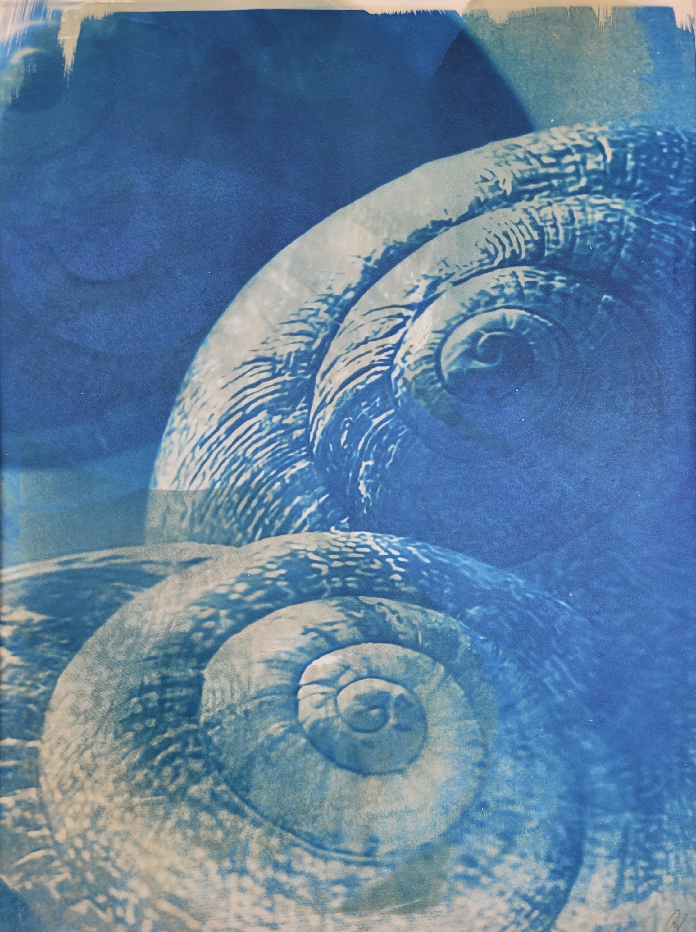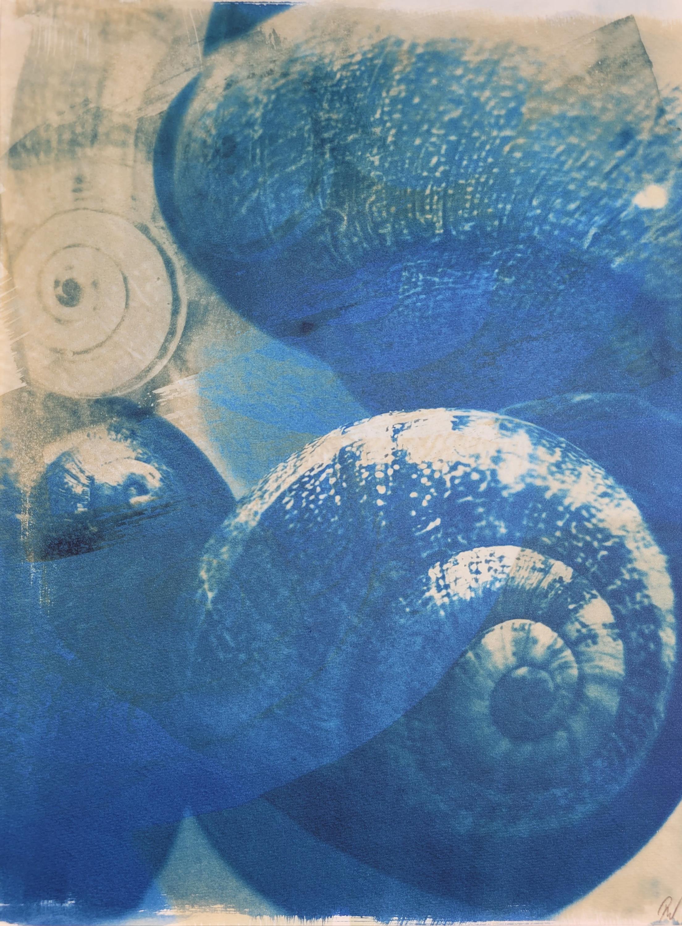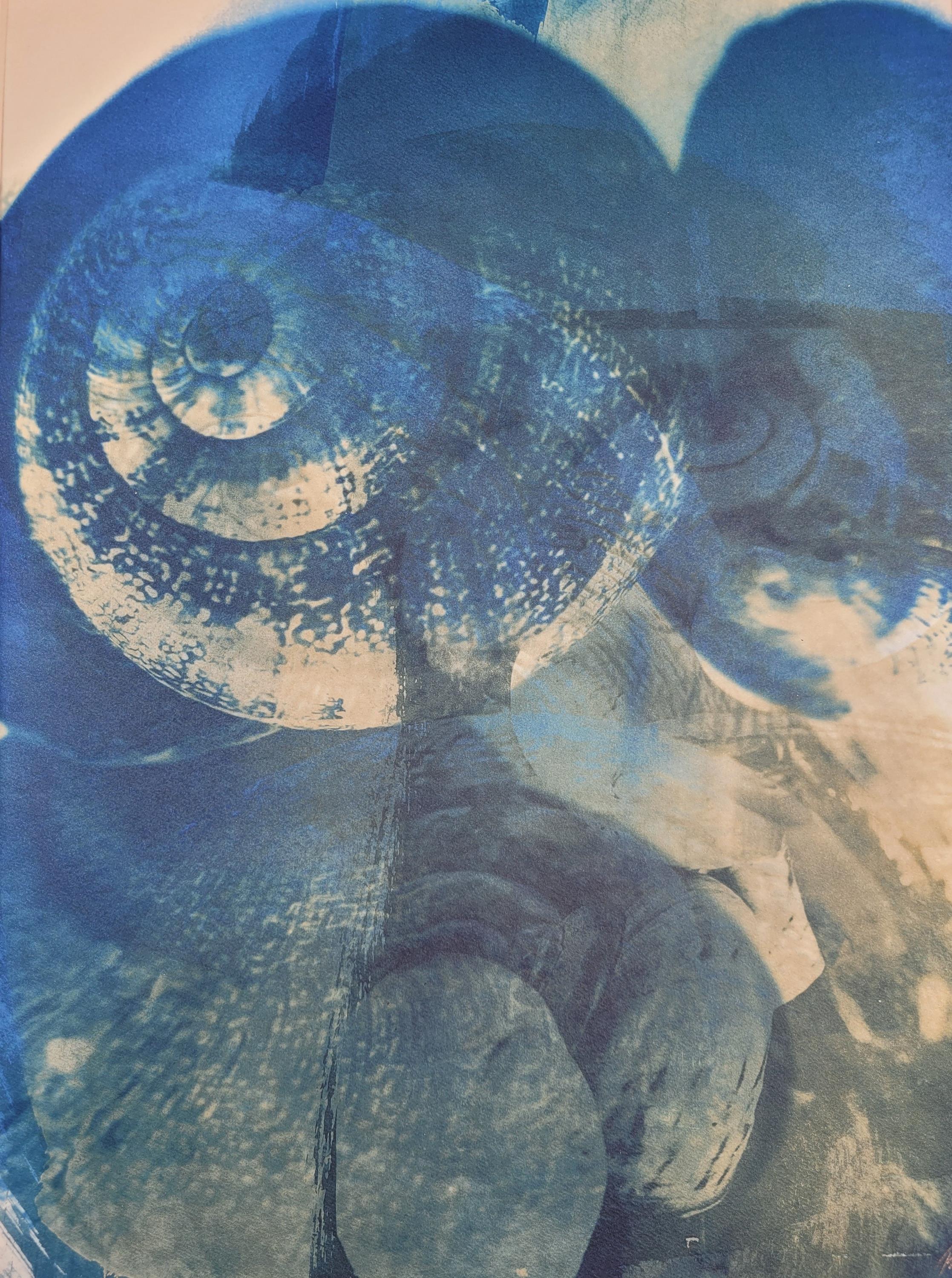 In den Cyanotopien verhandelt die Künstlerin auf poetische Weise existenzielle Bedürfnisse des Menschen. So stehen die Schneckengehäuse als Sinnbild des Rückzugs