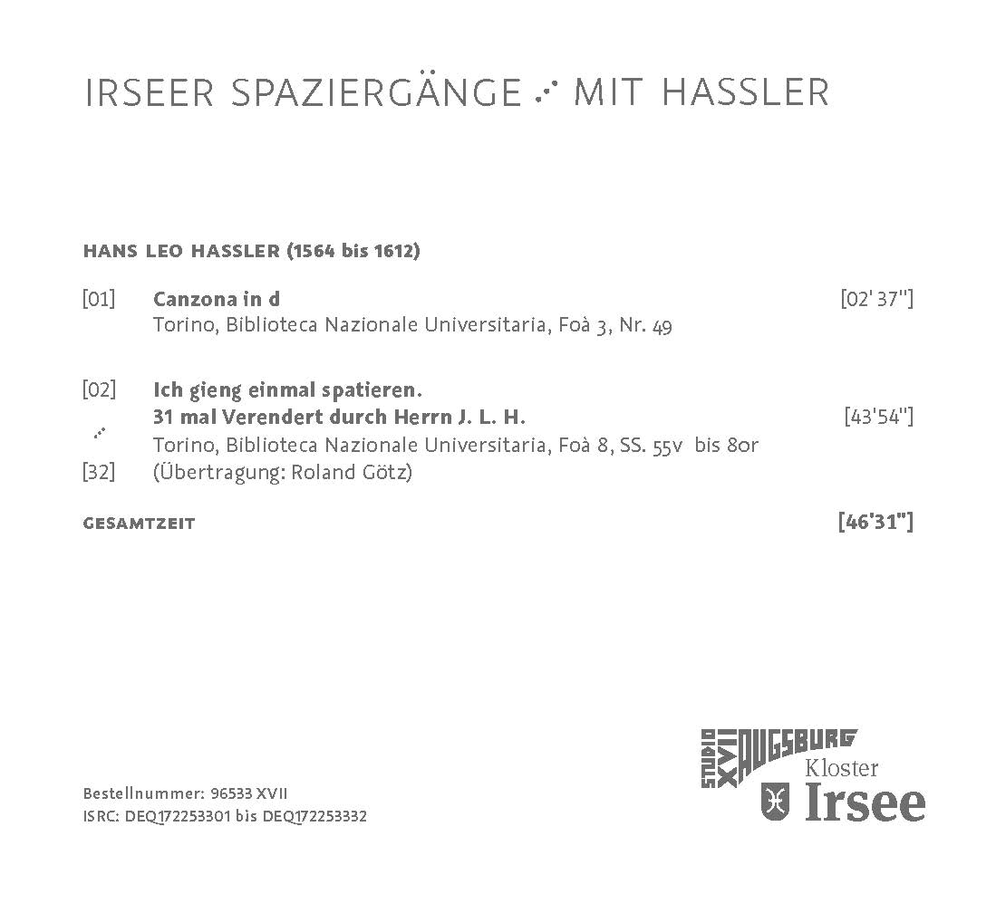Die CD „Irseer Spaziergänge – mit Haßler“ enthält alle 31 Variationen des knapp dreiviertel-stündigen Zyklus von Hans Leo Haßler sowie seine „Canzona in d“. Der Tonträger (Bestellnummer 96533 XVII) kann über studio XVII augsburg (www.studio-xvii-augsburg.de sowie über das Schwäbische Bildungszentrum Irsee (www.kloster-irsee.de zum Preis von € 16,- erworben werden.
